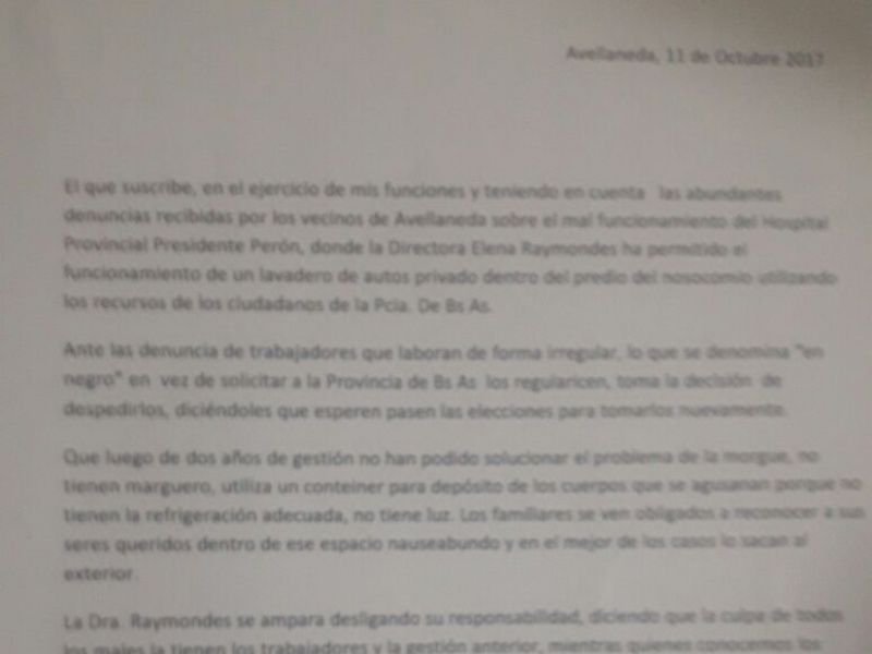 Luego de haberla denunciado en varias oportunidades, el concejal del bloque Podemos de Avellaneda, Daniel García, pidió la renuncia de la directora del hospital provincial Presidente Perón, Elena Raymondes. “Están dejando la salud del distrito en manos de quien no la sabe manejar”, dijo.