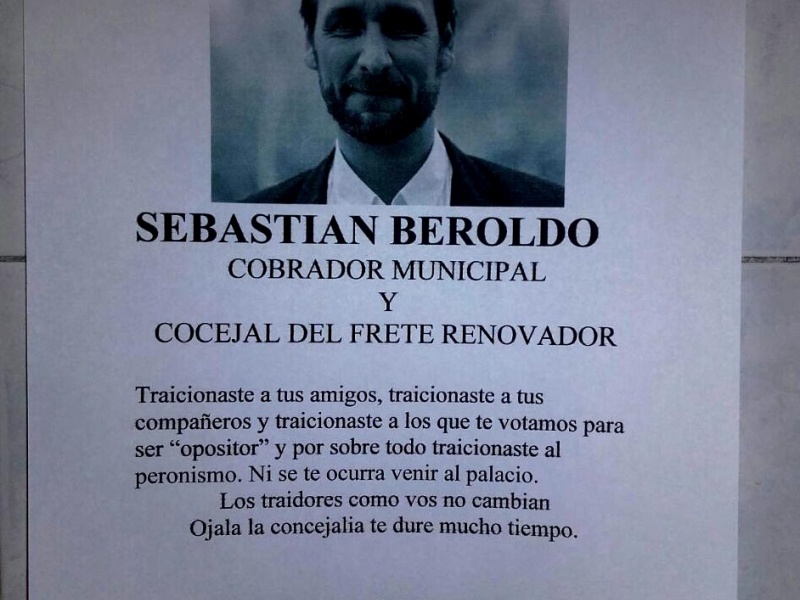 La decisión de terminar con los cobradores fue del propio Grindetti. Esta semana el intendente mandó al Concejo una ordenanza para poner fin con los privilegios. El documento les baja la comisión a 1,75 por ciento de la cobranza. Se irá bajando gradualmente hasta desaparecer. Es que la bancarización del pago de los impuestos es un hecho y se termina la caminata recaudadora. Los concejales acompañaron el proyecto, menos el bloque de Unidad Ciudadana. El propio Sebastián Beroldo -que fuera mucho tiempo cobrador- votó a favor del gobierno y en contra de sus ex compañeros de caminata. En la municipalidad hoy colocaron un cartel en el que lo tildan de “traidor”, declarándolo “persona no grata” y le aconsejan: “Ni se te ocurra venir por el palacio”. Es que Beroldo, por pedido de Gastón Rodríguez (nieto de Manolo), fue nombrado cobrador en el 2007.