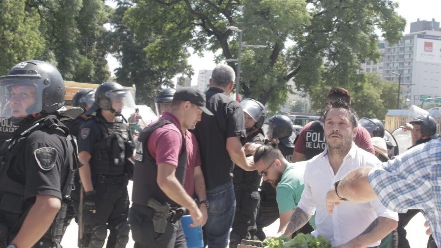 Cuando yo me acerqué a la actividad, rondando las 10.15, en los alrededores se apreciaban policías en el costado de la plaza. Pero, a medida que se fue armando la estructura de gazebos y las organizaciones que fueron parte de la actividad se iban acercando a plaza Constitución, un lugar público, y percibían que podían estar llegando las camionetas que traían la mercadería, la situación se puso tensa y planteaban la prohibición o no habilitación de este tipo de actividades.