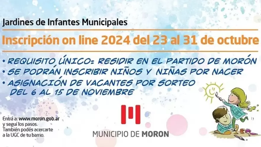 El municipio de Morón abre la solicitud para la preasignación de vacantes para inscribir a niños y niñas del distrito en alguno de los 16 jardines municipales, para el próximo ciclo lectivo 2024. La preinscripción estará abierta desde el próximo lunes 23 al 31 de octubre y será de forma online ingresando al siguiente link. También podrá realizarse el trámite en las UGC.
