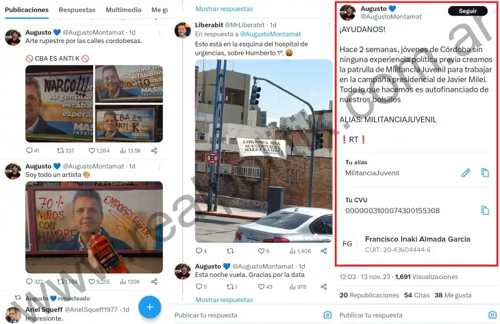 El líder del espacio es Augusto Montamat, “católico y patriota”, según se describe en su perfil de Twitter. Junto a un grupo de amigos, lanzó una campaña de donaciones para financiar panfletos y cartelería en favor de Javier Milei, pero también aerosoles para vandalizar publicidades del candidato de Unión por la Patria.