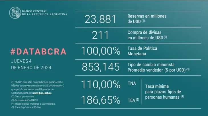 El dato surge de un nuevo decreto de necesidad y urgencia, designado 23/2024, que en su artículo 2 dispone: “Autorízase al órgano responsable de la coordinación de los sistemas de administración financiera a emitir letras denominadas en dólares estadounidenses, a ser suscriptas por el Banco Central de la República Argentina (BCRA), por un monto de hasta dólares estadounidenses tres mil doscientos millones (USD 3.200.000.000), a diez (10) años de plazo”.