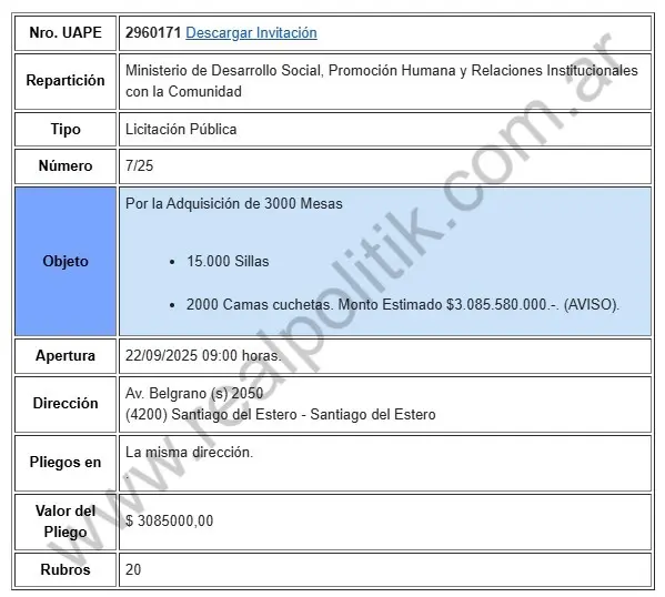 En Santiago del Estero, donde Gerardo Zamora maneja la provincia con mano de hierro desde hace casi dos décadas, se acaba de publicar una licitación pública que ya despierta todas las sospechas. Se trata del expediente 7/25 del ministerio de Desarrollo Social, Promoción Humana y Relaciones Institucionales con la Comunidad, cuyo objeto es la adquisición de 3 mil mesas, 15 mil sillas y 2 mil camas cuchetas, por un monto estimado en 3.085 millones de pesos.