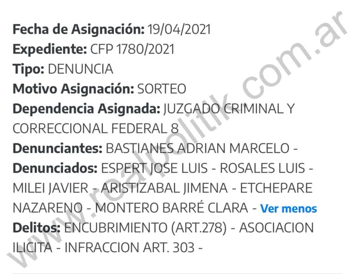 La presentación fue realizada por Adrián Marcelo Bastianes, presidente de Voz Ciudadana, quien pidió que se investigue a Espert y a su entorno por el presunto financiamiento ilegal de la campaña presidencial de 2019. En el escrito, al que accedió REALPOLITIK, se señala de manera contundente: “Vengo a formular la presente denuncia, a los fines de que se investigue la presunta comisión de los delitos de encubrimiento, lavado de activos provenientes del narcotráfico, asociación Ilícita… encontrando eventualmente responsable (…) a José Luis Espert, Luis Rosales, Jimena Aristizabal, Nazareno Etchepare y Clara Montero Barré”.