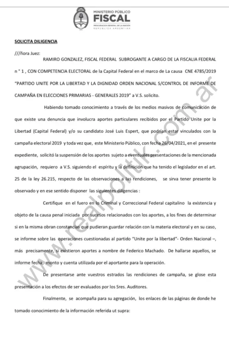 El fiscal federal Ramiro González ya había requerido medidas en el marco de la causa CNE 4785/2019, donde pidió certificar la existencia de aportes en favor de Espert y exigió que “informe sobre las operaciones cuestionadas al partido Unite por la Libertad, más precisamente si existieron aportes a nombre de Federico Machado”.