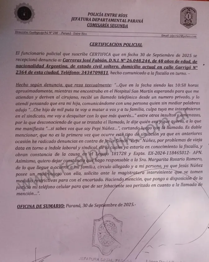 La trama también incluye amenazas directas contra denunciantes. José Fabián Carreras, extrabajador municipal y una de las primeras voces en denunciar las irregularidades, fue despedido en represalia y más tarde recibió un llamado telefónico intimidatorio. Núñez le advirtió: “Si intervienen el sindicato, voy a ir por lo que más querés”, en alusión a su familia. Carreras radicó una denuncia ante la policía, pero reconoce sentir temor, especialmente porque el sindicalista cuenta con protección política.