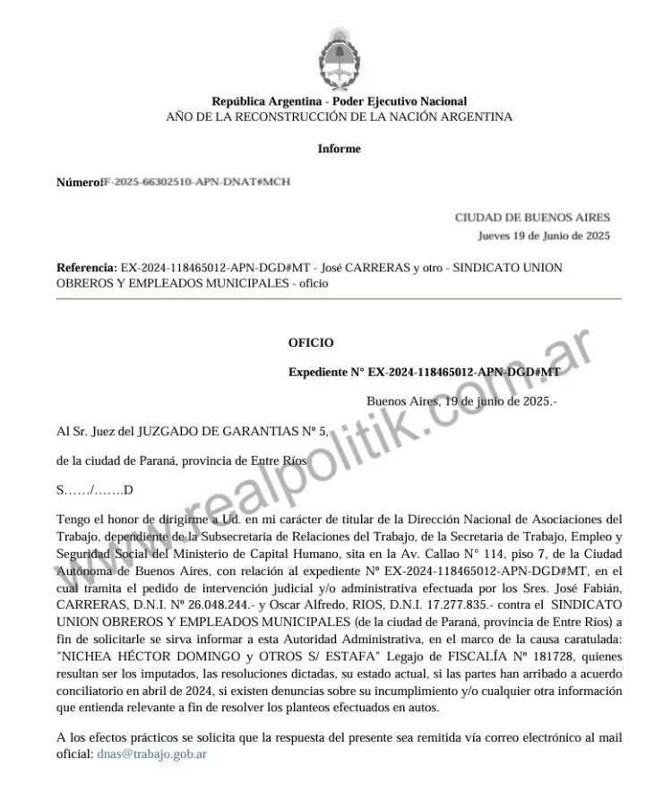Mientras tanto, el Superior Tribunal de Justicia de Entre Ríos le dio la razón a Carreras en otra causa, al ordenar que la municipalidad de Paraná le pague su salario tras un despido irregular promovido desde el propio entorno sindical. La resolución dejó en evidencia la estrategia de persecución contra el denunciante y el rol del municipio en avalar esas maniobras.