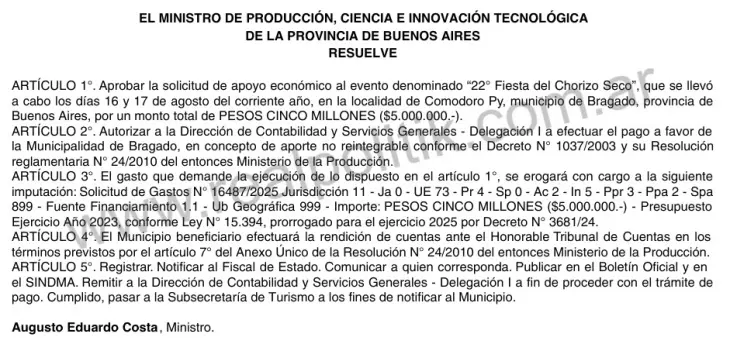 Pero el sentido común suele chocar contra la extraña lógica del gobernador. Esta semana, el Boletín Oficial bonaerense sorprendió con la resolución 379-MPCEITGP-2025, firmada por el ministro de Producción, Ciencia e Innovación Tecnológica, Augusto Costa. En ella se consigna el otorgamiento de 5 millones de pesos en concepto de “apoyo económico” a la fiesta del Chorizo Seco, que se realizó en la localidad de Comodoro Py, municipalidad de Bragado, lo que despierta inconsistencias en el marco de otro tipo de gastos esenciales postergados por el gobierno de Axel Kicillof, como los reclamos paritarios..