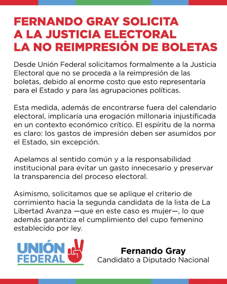 El candidato a diputado nacional por Unión Federal, Fernando Gray, presentó un pedido formal ante la Justicia Electoral para que no se lleve adelante la reimpresión de boletas, argumentando que la medida implicaría un gasto millonario e innecesario tanto para el Estado como para las agrupaciones políticas.