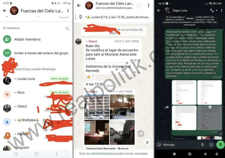 Fuentes presentes en el evento indicaron que varios micros provenientes de Lanús fueron organizados directamente por el equipo de Sebastián Pascual, en coordinación con militantes vinculados a Luna y Romo. “Él está en la organización, tiene todo el control de quién entra y quién no. Los carteles dicen Fuerza del Cielo Lanús y lo mencionan a él como referente”, confirmó una fuente libertaria bonaerense a este medio.