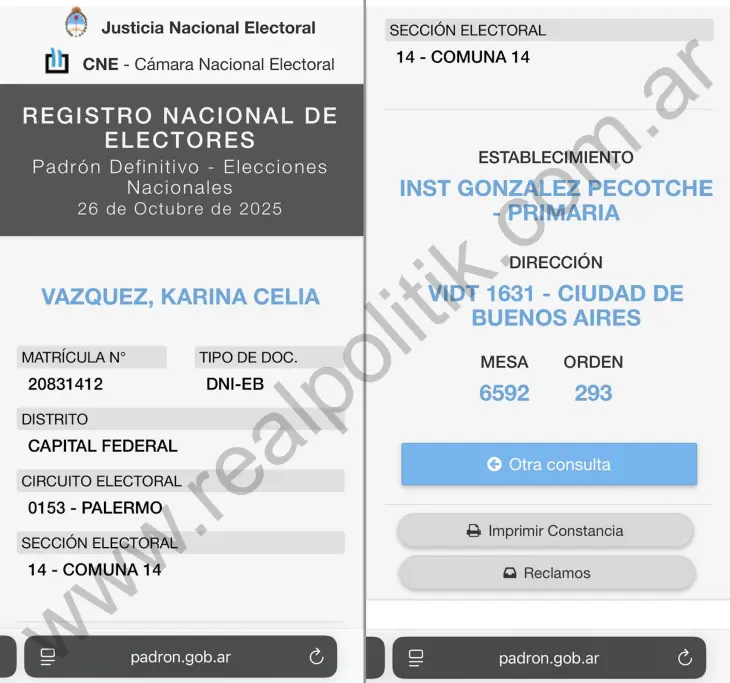 La exmodelo y exfigura de tapa de la revista Playboy, Karen Reichardt —inscripta en el padrón como Karina Celia Vázquez—, encabezará la lista de La Libertad Avanza para la Cámara de Diputados de la Nación Argentina por la provincia de Buenos Aires tras la renuncia de José Luis Espert. Sin embargo, el padrón electoral definitivo revela que Reichardt no vota en la provincia que busca representar, sino en la Ciudad de Buenos Aires: figura asignada a la mesa 6592 del colegio Logosófico González Pecotche - Nivel Primario, una escuela primaria ubicada en Vidt 1631, barrio de Palermo.