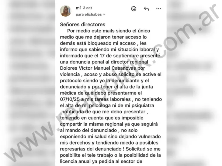 “Nos están haciendo la vida imposible. En vez de apartar al director denunciado, nos quieren mover a nosotras. Es violencia institucional”, denunció Viviana Moyano, quien se encuentra bajo tratamiento psicológico por crisis de ansiedad y ataques de pánico derivados de la situación. Su psicóloga, la licenciada Natalia Cociña, advirtió que el regreso de la paciente a su lugar de trabajo sin garantizar condiciones seguras podría “perjudicar severamente su salud psicoemocional”.