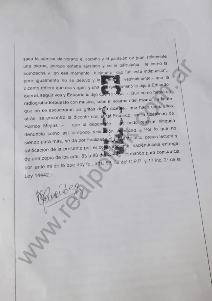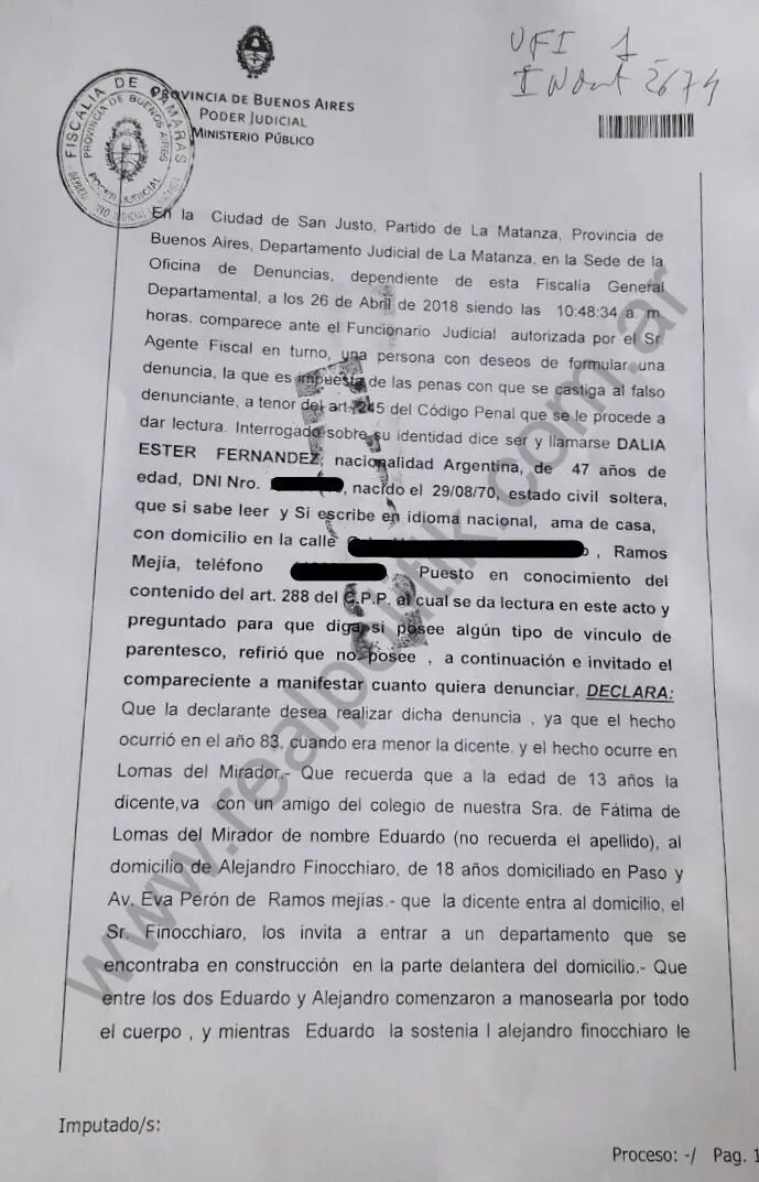 Dalia Ester Fernández declaró ante la UFI Nro. 1 de La Matanza que el funcionario la violó cuando ella tenía trece años y él dieciocho, en una vivienda en Lomas del Mirador. “Alejandro Finocchiaro me violó. Tenía un cómplice. Me llevaron engañada a una propiedad. Él era vecino mío, íbamos todos al mismo colegio. Uno me tenía y el otro, Finocchiaro, abusó de mí”, relató la víctima en una entrevista cara a cara con este medio.