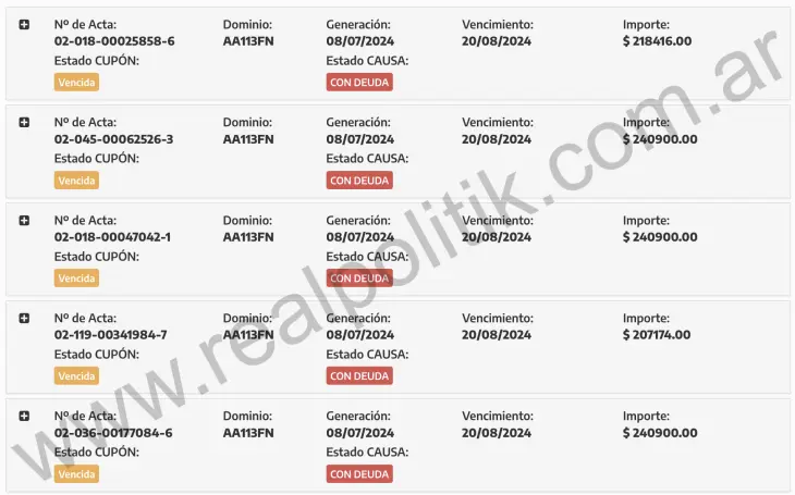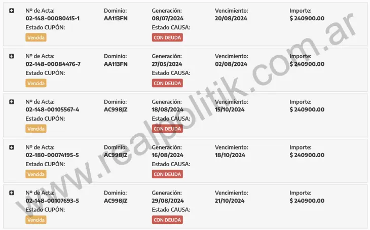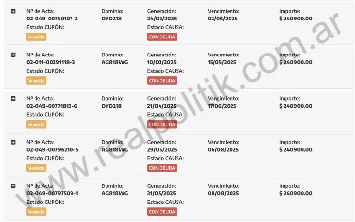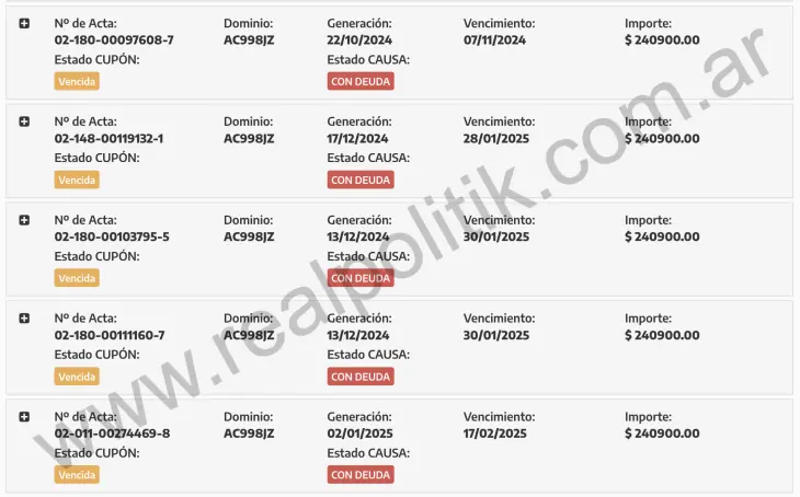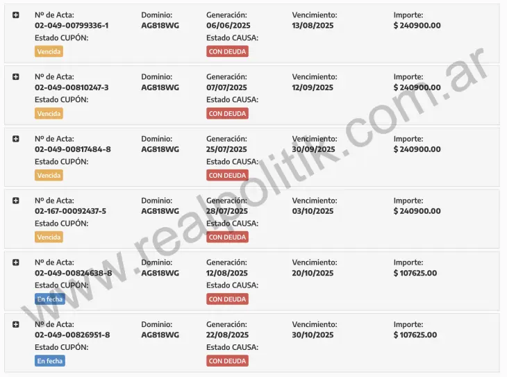 Incluso las más recientes, fechadas en agosto de 2025 (actas 02-049-00824638-8 y 02-049-00826951-8), continúan “en fecha” pero figuran con causa “con deuda”, lo que implica que Carrancio no ha efectuado ningún pago.