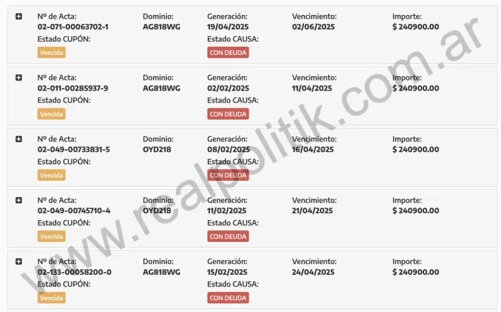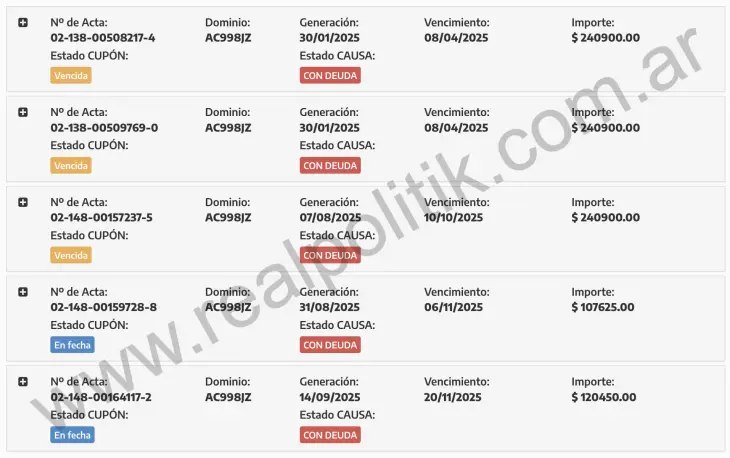 Entre las más recientes figuran las actas 02-148-00157237-5 y 02-148-00164117-2, generadas en agosto y septiembre de 2025, con vencimientos en octubre y noviembre próximos. En ambos casos, los importes rondan los 120 mil pesos por cada multa.
