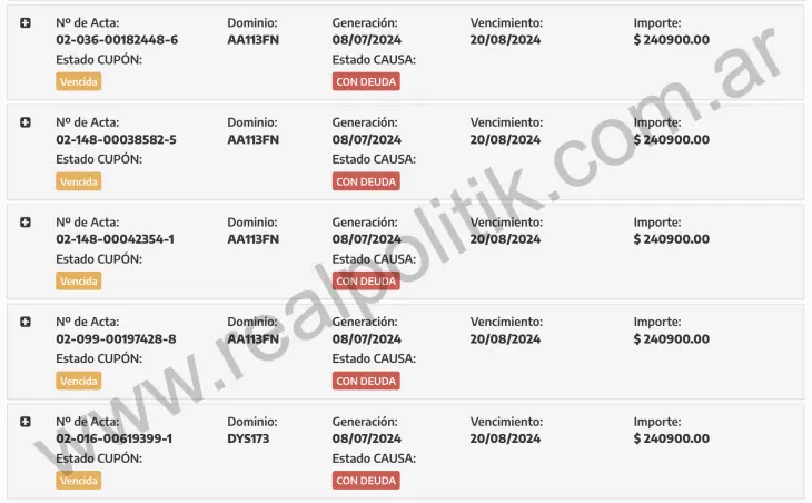Entre los dominios AG818WG y OYD218, el dirigente acumula 3.587.850 pesos en infracciones impagas, todas vencidas entre abril y octubre de 2025.