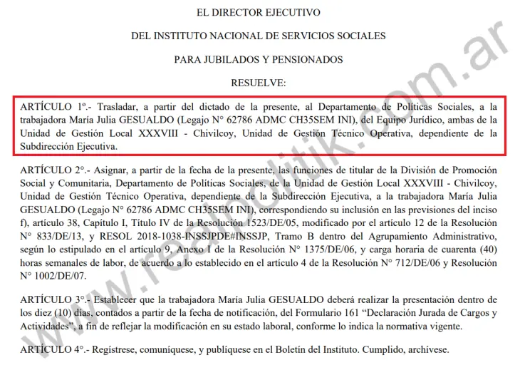 Su ascenso coincidió con una serie de reacomodamientos internos, especialmente en la sede de Chivilcoy, donde se desplazó personal histórico y se designó a María Julia Gesualdo, hermana de Carla, como jefa de Promoción Social. El regreso de los apellidos familiares marcó el regreso de las viejas prácticas.