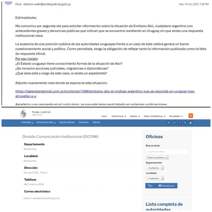 En las últimas semanas, oficinas del poder judicial uruguayo y áreas vinculadas a lo contencioso-administrativo registraron un incremento inusual de llamados y correos electrónicos provenientes de medios argentinos que buscan confirmar la existencia de actuaciones, estados procesales y eventuales medidas relacionadas con Emiliano Aloi.