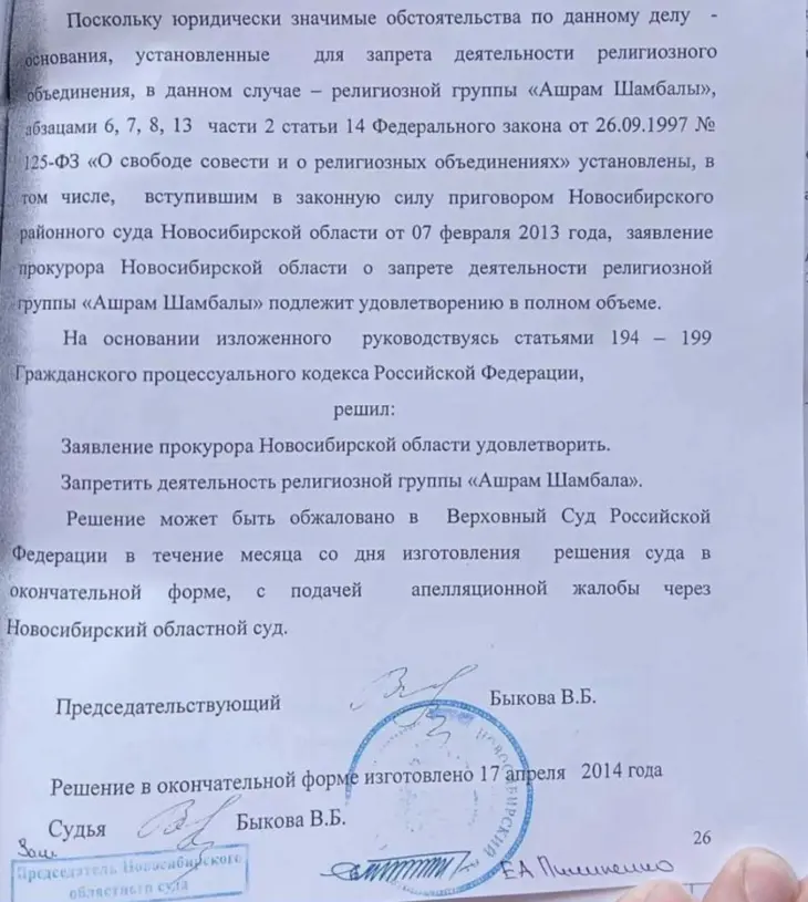 DOCUMENTO: Sentencia judicial que prohíbe el "Ashram de Shambala"