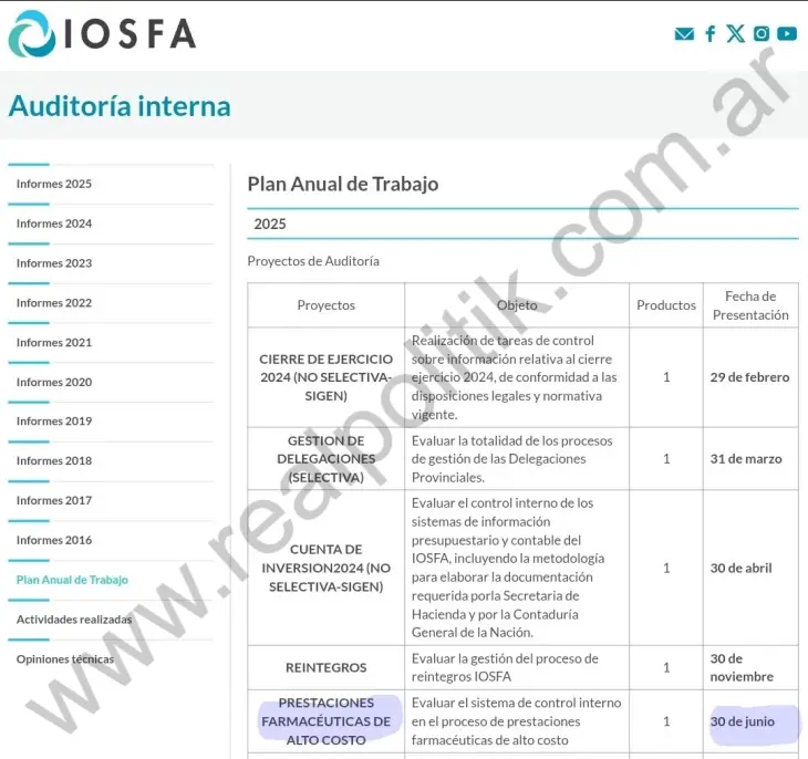 Pero eso no es todo. La decisión se da en paralelo con la parálisis de la auditoría interna del IOSFA, que debía presentar en junio un informe clave sobre el sistema de medicamentos de alto costo, justamente aquellos vinculados a las compras realizadas a Suizo Argentina y otras que figuran en los expedientes. Según fuentes internas del organismo, la auditoría no solo no fue publicada en la página oficial del IOSFA, como indica el protocolo de transparencia, sino que directamente no habría sido realizada por orden de las máximas autoridades del instituto.