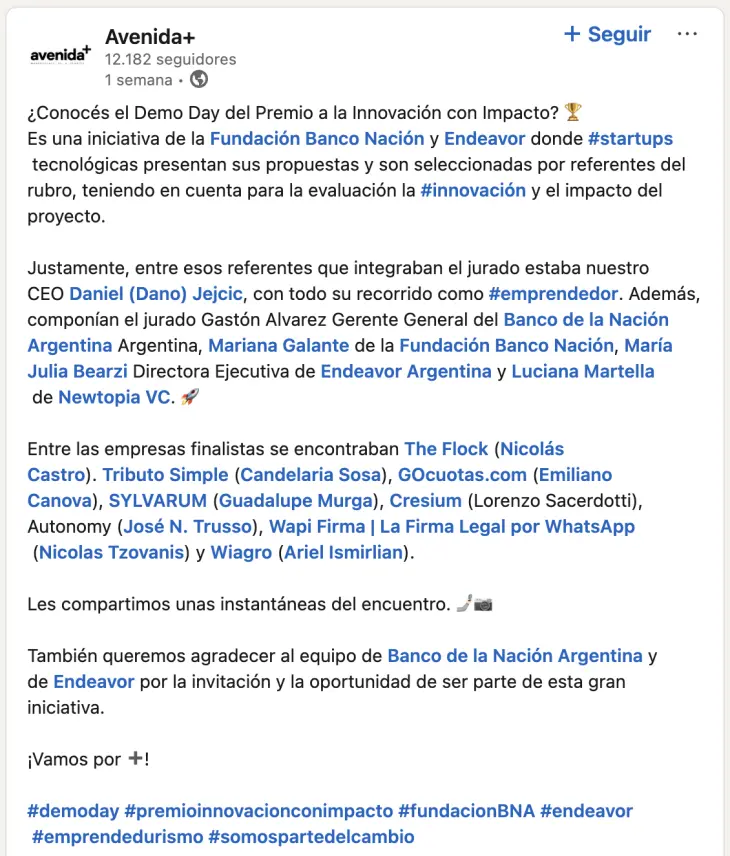 Los vínculos entre los ejecutivos del Banco Nación y Avenida+ están lejos de ser un secreto. En publicaciones recientes, Avenida+ celebró su participación como jurado junto a Gastón Álvarez (BNA) en el “Premio a la Innovación con Impacto”, una iniciativa conjunta entre la fundación Banco de la Nación Argentina y Endeavor. En el mismo evento participaron también referentes de Endeavor Argentina y Newtopia VC, lo que muestra cómo el ecosistema emprendedor se usa como pantalla para legitimar una relación de negocios millonaria.