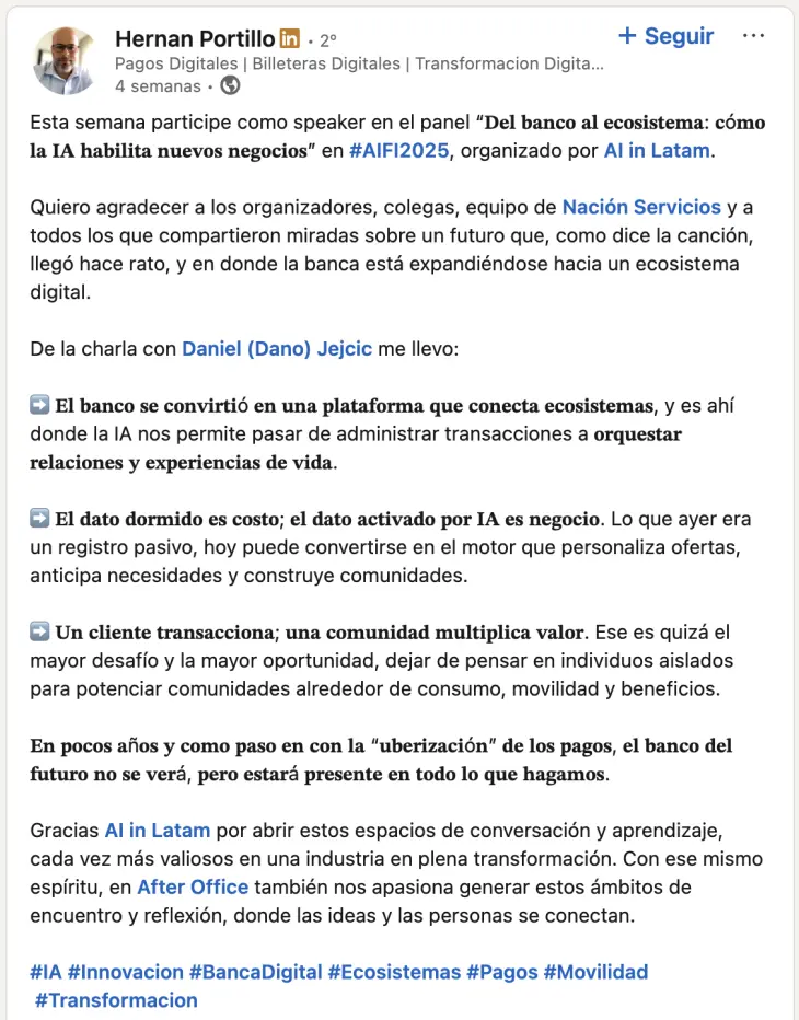 Por su parte, Hernán Portillo, titular de Nación Servicios, compartió otro posteo en el que agradece haber sido ponente junto a Daniel Jejcic en el panel “Del banco al ecosistema: cómo la IA habilita nuevos negocios”, del evento AIFI 2025, donde se autodefinen como “socios estratégicos en la transformación digital del banco”.