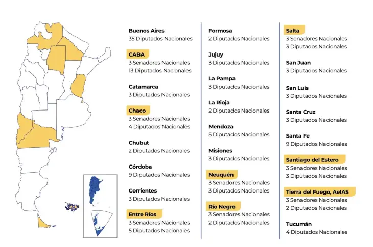 En los otros 8 distritos se elegirán diputados y senadores nacionales: Salta, Neuquén, Río Negro, Tierra del Fuego, Chaco, Santiago del Estero, Entre Ríos y Ciudad de Buenos Aires.