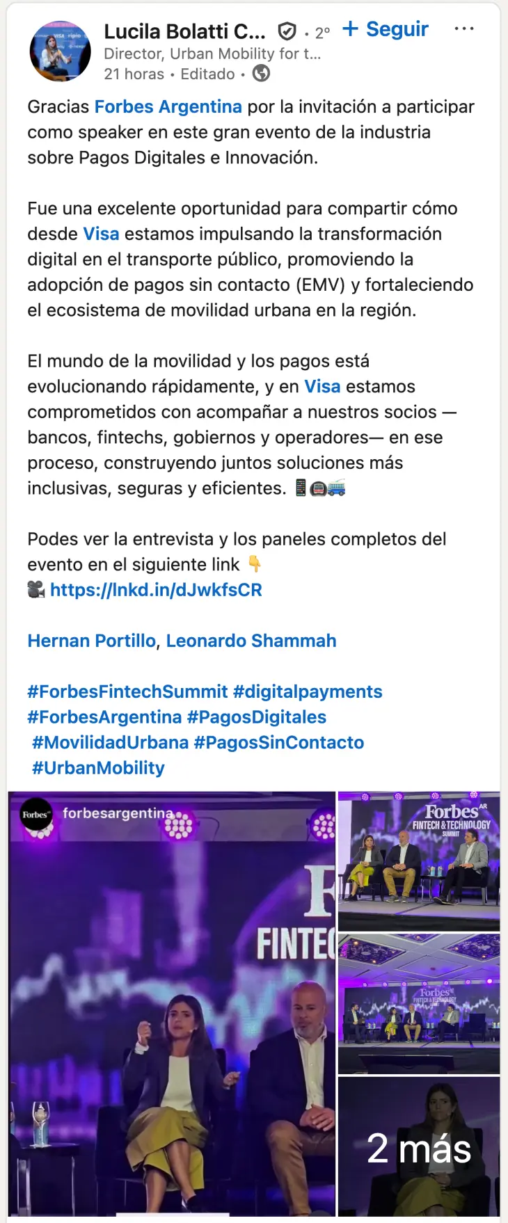 La alianza entre Nación Servicios y VISA se volvió tan estrecha que el propio Hernán Portillo fue invitado como speaker a los eventos de Forbes y VISA, donde se lo exhibe como figura destacada del sector fintech argentino. En uno de los paneles recientes —difundido por la ejecutiva de VISA, Lucila Bolatti Cristofaro— Portillo compartió escenario con Leonardo Shammah, discutiendo “innovación en pagos digitales y movilidad urbana”. En esos encuentros, VISA presentó su modelo de pago sin contacto (EMV) como “el futuro del transporte público en la región”, con el cuestionado Portillo como socio estratégico.