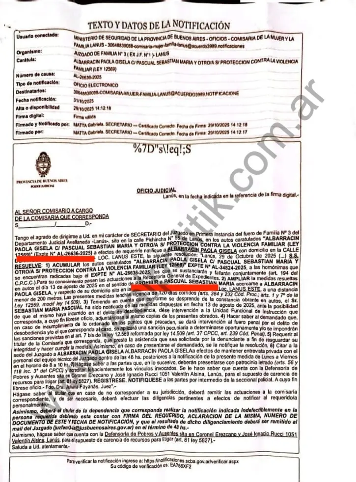 La medida se originó tras la acumulación de dos expedientes –AL-26636-2025 y AL-34324-2025– en los que se investigan distintos episodios de hostigamiento y amenazas contra Albarracín. Según el texto judicial, se ordenó además notificar a la comisaría correspondiente para garantizar el cumplimiento efectivo de la perimetral.