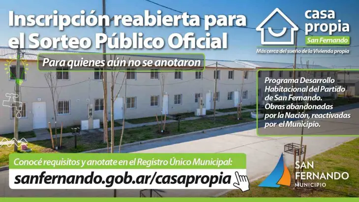 A través del sitio oficial www.sanfernando.gob.ar/casapropia, los sanfernandinos podrán acceder al formulario de inscripción, consultar los requisitos y conocer los detalles de financiación. Además, el Municipio confirmó que en los próximos días se sortearán 46 viviendas destinadas a familias numerosas, y que en abril de 2026 se sumarán otras 46 unidades correspondientes al ex programa nacional “Casa Propia”.