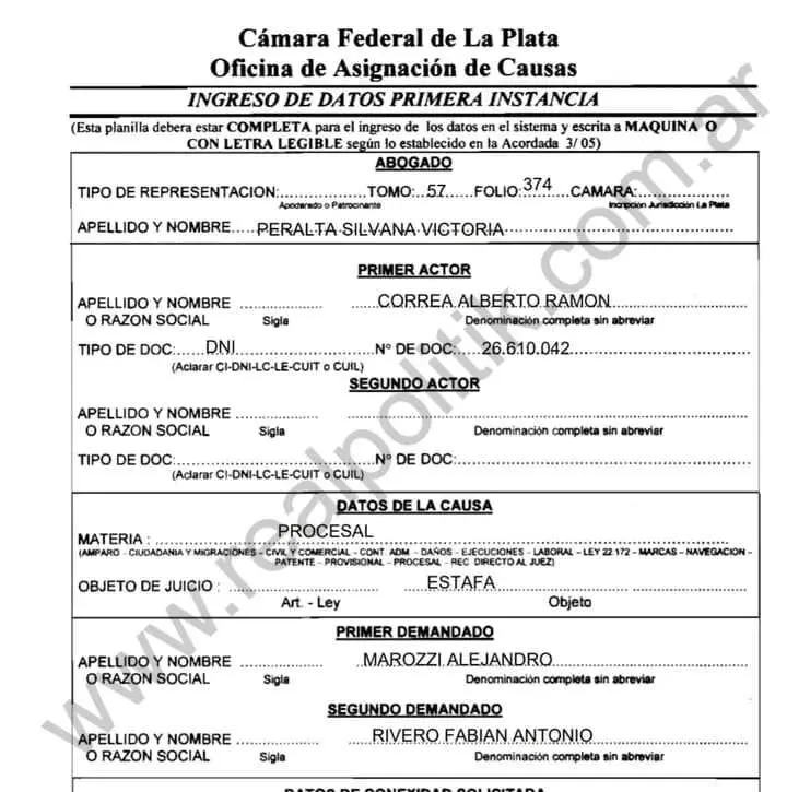 El expediente, registrado bajo patrocinio de la abogada Silvana Victoria Peralta, tiene como primer actor al denunciante Alberto Ramón Correa, quien acusa a ambos funcionarios y a un grupo de empleados del organismo bonaerense de haberle provocado perjuicios económicos y profesionales mediante la supuesta manipulación irregular de frascos testigo en controles antidoping, entre otras maniobras.