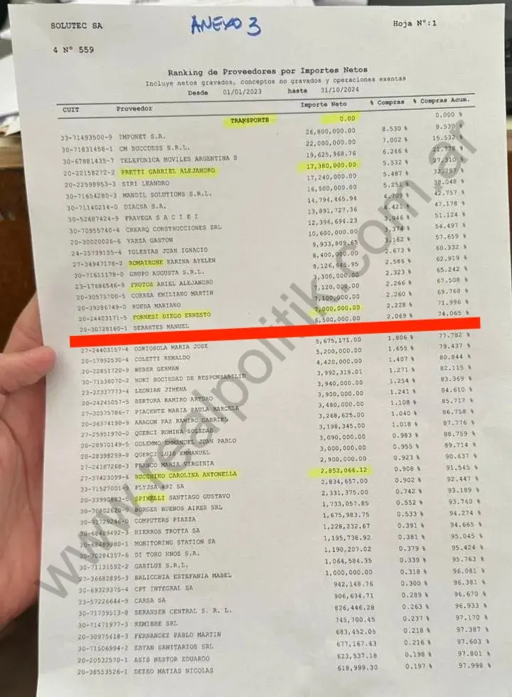 De acuerdo a los registros revelados en el marco de la causa, Manuel Serantes, jefe del Departamento de Administración de Proyectos en ARBA y hombre cercano a Cristian Girard, figura entre los beneficiarios de las transferencias de Solutec SA: cobró 6.500.000 provenientes de la empresa presidida por Sebastián Desio, operador clave de la Verificación Técnica Vehicular (VTV) y militante del Frente Renovador.