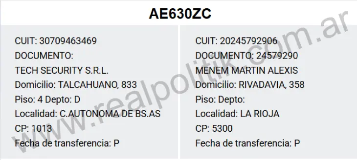 - AE630ZC, a nombre de Martín Menem y Tech Security SRL.