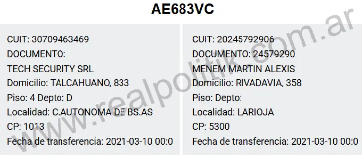- AE683VC, a nombre de Martín Menem y Tech Security SRL.