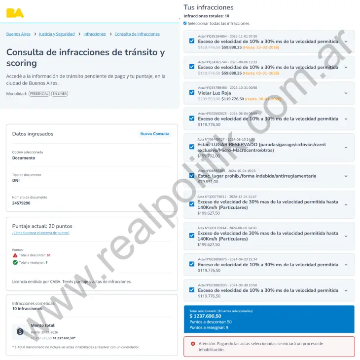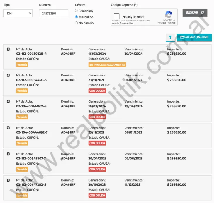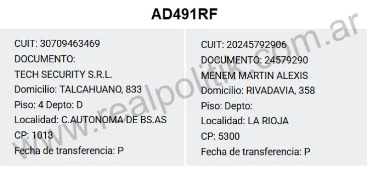 En la base de infracciones de tránsito de la Ciudad de Buenos Aires, el DNI de Martín Menem figura asociado a la patente AE115EE con un total acumulado de 1.237.690,50 en multas. Pero en la provincia de Buenos Aires aparece algo más llamativo: el DNI del diputado (24.579.290) figura vinculado a una serie de multas por un total de 1.539.900 pesos, asociadas al Toyota AD491RF, un vehículo que no fue hecho público en su DDJJ. En las bases consultadas por REALPOLITIK, ese mismo vehículo figura también a nombre de Tech Security SRL.