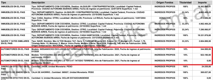 - Toyota SW4 4x4 SRX 2.8 TDI 2021, ingresado al patrimonio en 03/2021, también con ingresos propios y siendo titular del 10 por ciento.