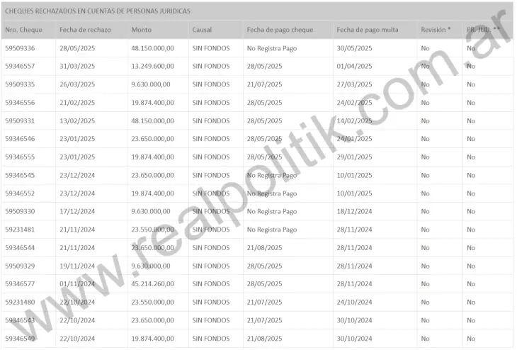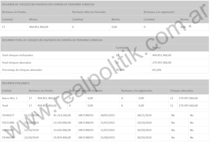 El punto crítico de la documentación aparece en la central de cheques rechazados, donde el fideicomiso acumula diecisiete cheques sin fondos, por un total de 404.851.460 de pesos.