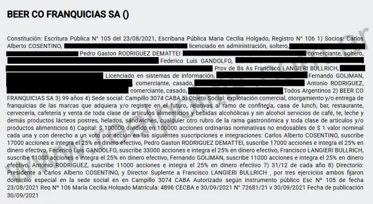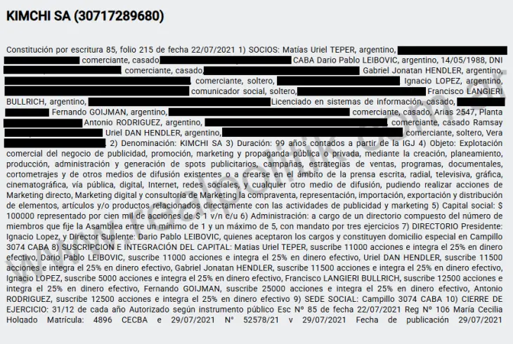 El salto definitivo llegó en 2021, cuando aparece en la estructura de Beer Co Franquicias SA y Kimchi SA, conformadas en pocos meses y con el mismo núcleo duro de socios: Matías Teper, Darío Leibovic, Gabriel Jonatan Hendler, Uriel Dan Hendler, Fernando Goijman y Antonio Rodríguez. un grupo heterogéneo —algunos comerciantes, otros técnicos— pero que comparte un mismo domicilio social: Campillo 3074, una dirección que se repite también en otras sociedades vinculadas al holding.