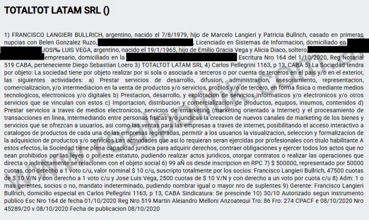 Pero hacia 2020, de manera prácticamente súbita, pasó de ser un exempleado estatal sin trayectoria empresarial a manejar sociedades con capitales de difícil justificación frente a su actividad previa. Fue en ese momento cuando constituyó Totaltot Latam SRL, donde quedó como socio mayoritario con 47.500 cuotas, administrador y gerente, y cuya sede en Carlos Pellegrini 1163 anunciaba manejar servicios digitales y comerciales de amplio espectro.