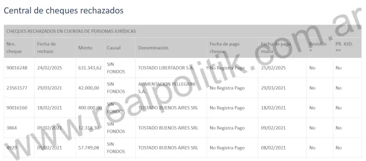 Los rechazos involucran a: Tostado Buenos Aires SRL, Alimentación Pellegrini SA y Tostado Libertador SA.