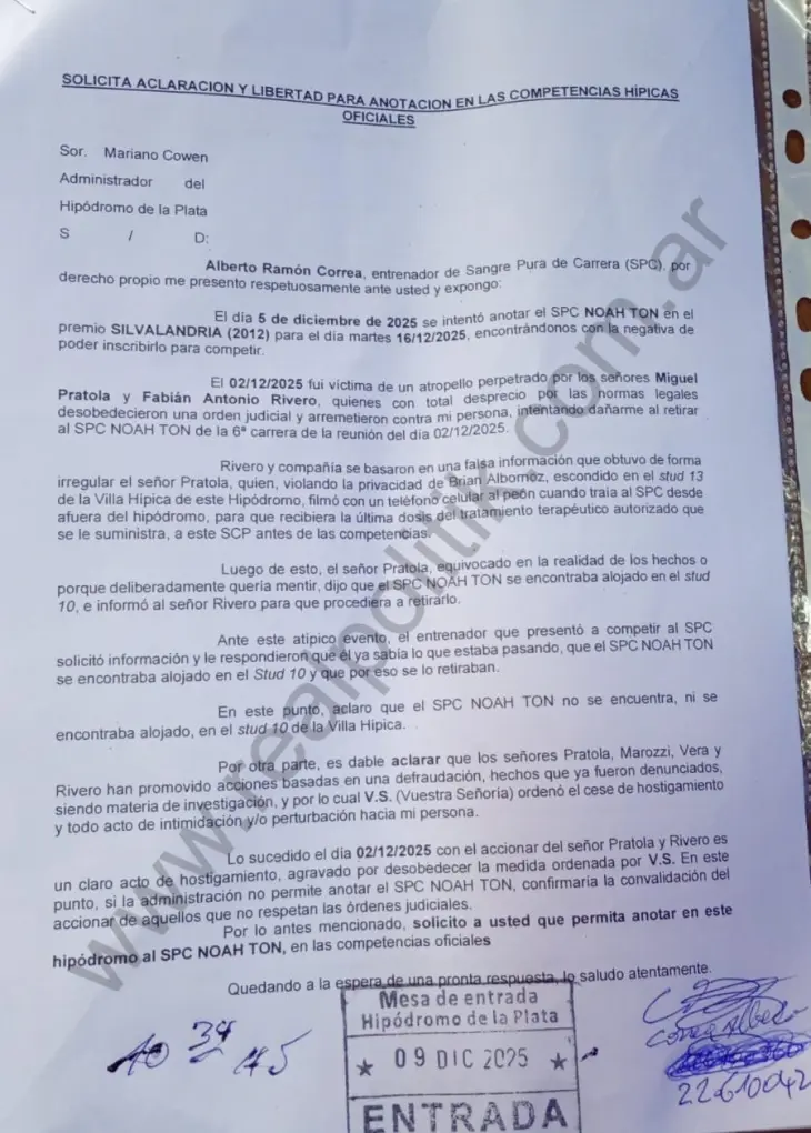 En la nota ingresada formalmente en Mesa de Entradas —a la que este medio tuvo acceso— Correa solicitó “aclaración y libertad para la anotación en las competencias oficiales”, afirmando que impedirle inscribir al SPC Noah Ton equivale a convalidar el accionar ilegal de quienes desobedecieron la orden del juzgado.