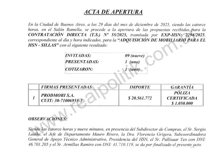 La contratación directa incluyó la invitación a nueve empresas, pero finalmente solo una presentó oferta: Prodmobi SA, que quedó así como única candidata para proveer el mobiliario. La falta de competencia real no pasó inadvertida, sobre todo teniendo en cuenta el monto involucrado y la naturaleza del gasto.