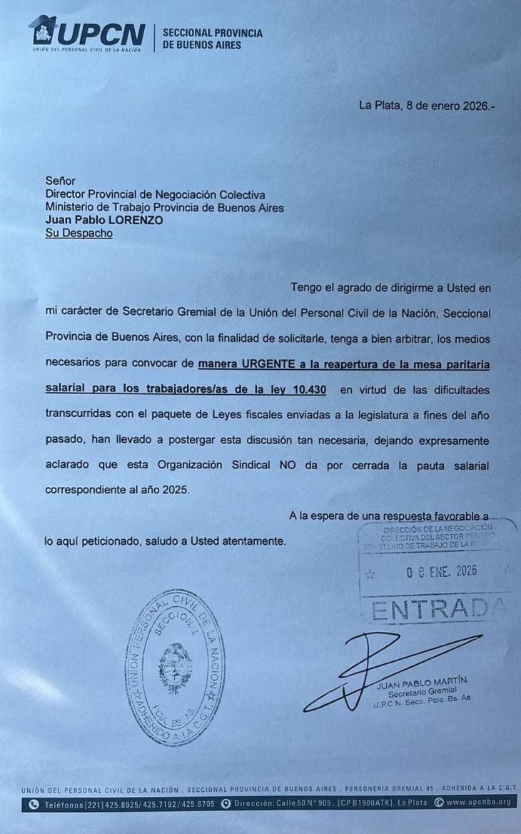 El pedido fue elevado el 8 de enero de 2026 al director provincial de Negociación Colectiva del ministerio de Trabajo de la provincia de Buenos Aires, Juan Pablo Lorenzo, mediante una nota firmada por el secretario Gremial de la organización, Juan Pablo Martín, y ya cuenta con sello de entrada oficial del organismo.