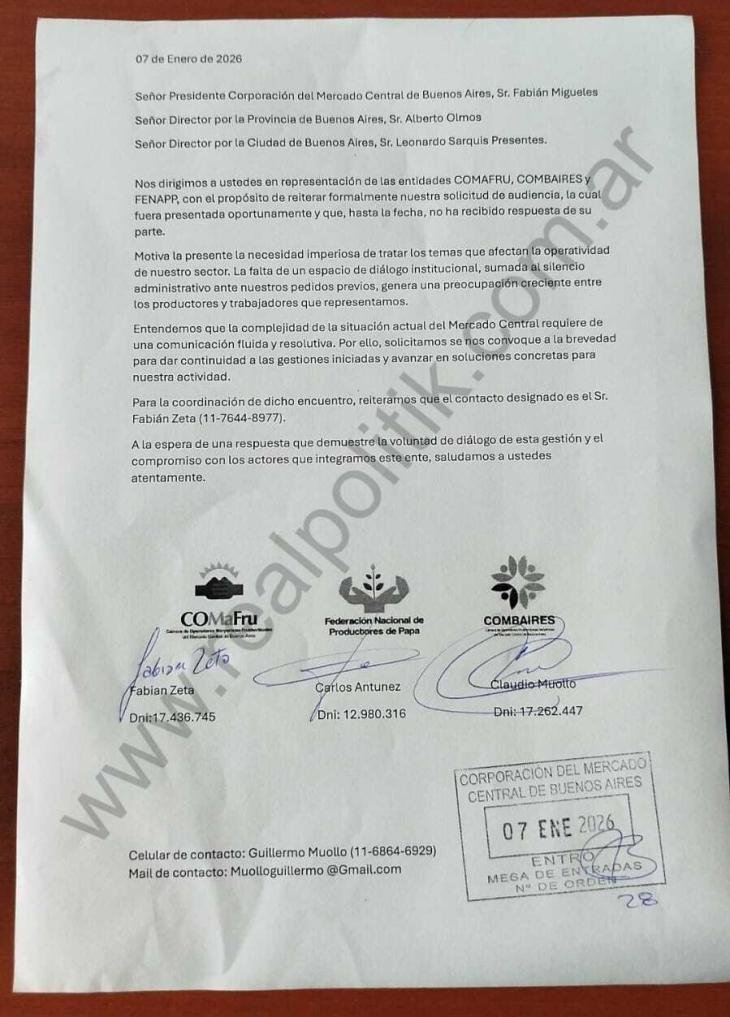 El episodio ocurre apenas horas después de que ingresara por mesa de entradas del Mercado Central, el 7 de enero de 2026, una nota firmada por las entidades COMAFRU, COMBAIRES SA y FENAPP, en la que se solicita formalmente una audiencia urgente con las autoridades del organismo.