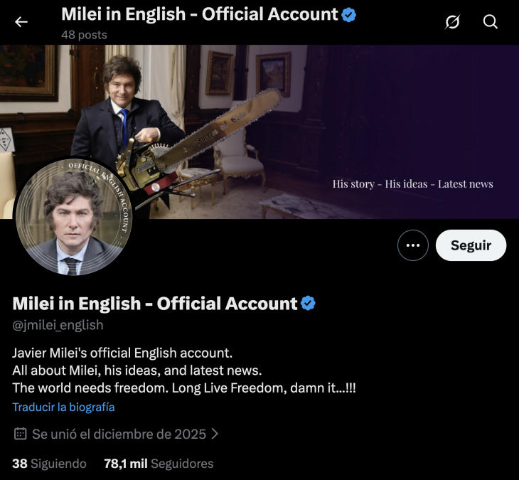 La propia descripción del perfil no deja lugar a dudas: “Javier Milei's official English account. All about Milei, his ideas, and latest news”. Es decir, no se trata de una cuenta ajena, sino de una extensión oficial de la comunicación presidencial.