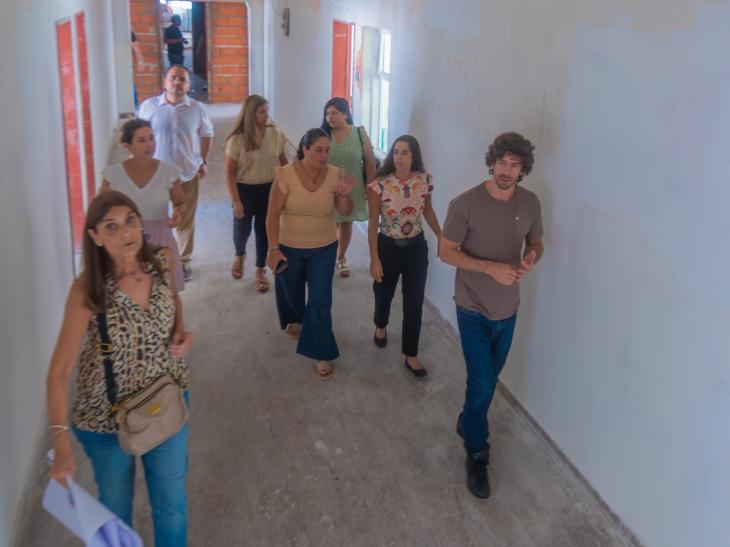 Durante la recorrida, Juan Andreotti estuvo acompañado por la Secretaria de Obras Públicas, Cecilia Tucat; la Subsecretaria de Desarrollo Social, Educación y Medio Ambiente, Analía Medina; la Directora General de Educación, Victoria Varela; y la Presidenta del Consejo Escolar, Sandra Bergandi, junto a arquitectas del Municipio.
