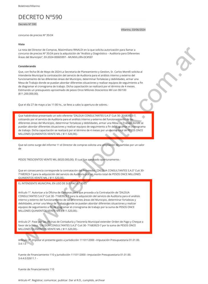 Las adjudicaciones, firmadas por el intendente Carlos Bevilacqua, corresponden a auditorías, manuales de procedimientos y consultorías sobre el funcionamiento interno del estado municipal. Todas fueron otorgadas a la misma firma y suman 97.020.000, una cifra significativa para un municipio pequeño, con reiterados discursos oficiales sobre ajuste, escasez de recursos y limitaciones presupuestarias.