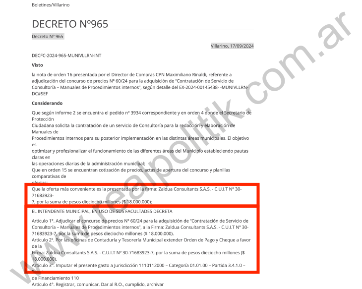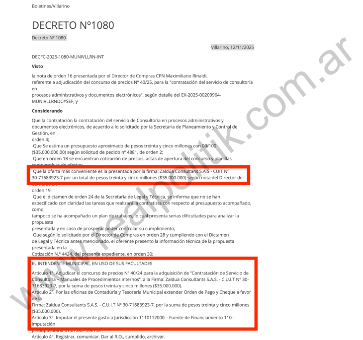 En un distrito de apenas 32.717 habitantes, según el censo 2022, el municipio de Villarino destinó entre junio de 2024 y noviembre de 2025 casi 100 millones en contrataciones directas y concursos de precios a una misma empresa: Zaldúa Consultants SAS.