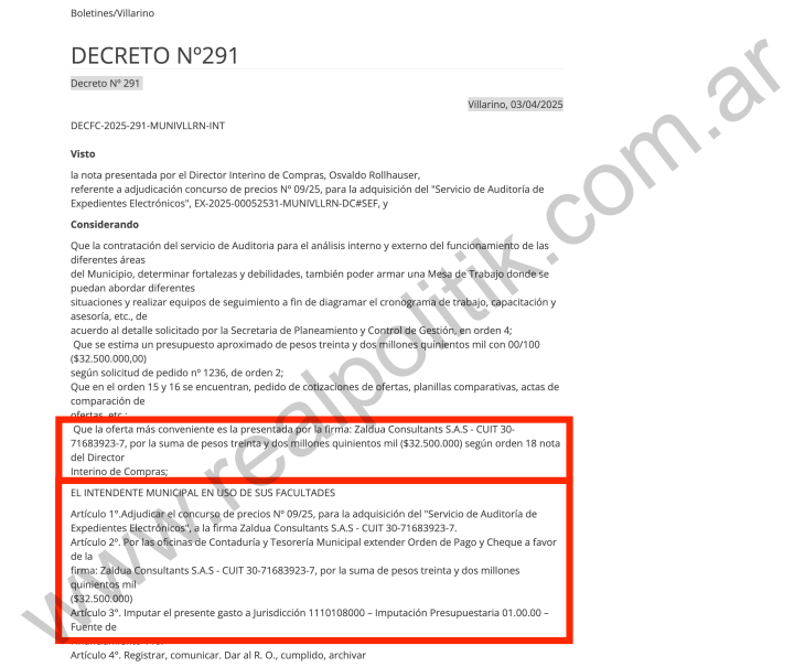 - Abril de 2025: auditoría de expedientes electrónicos y funcionamiento interno por 32.500.000 de pesos.