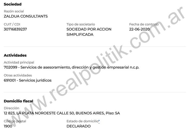 En todos los casos, el adjudicatario fue Zaldúa Consultants SAS, sociedad por acciones simplificada constituida en 2020, con domicilio en la ciudad de La Plata y dedicada al asesoramiento en gestión empresarial y servicios jurídicos.